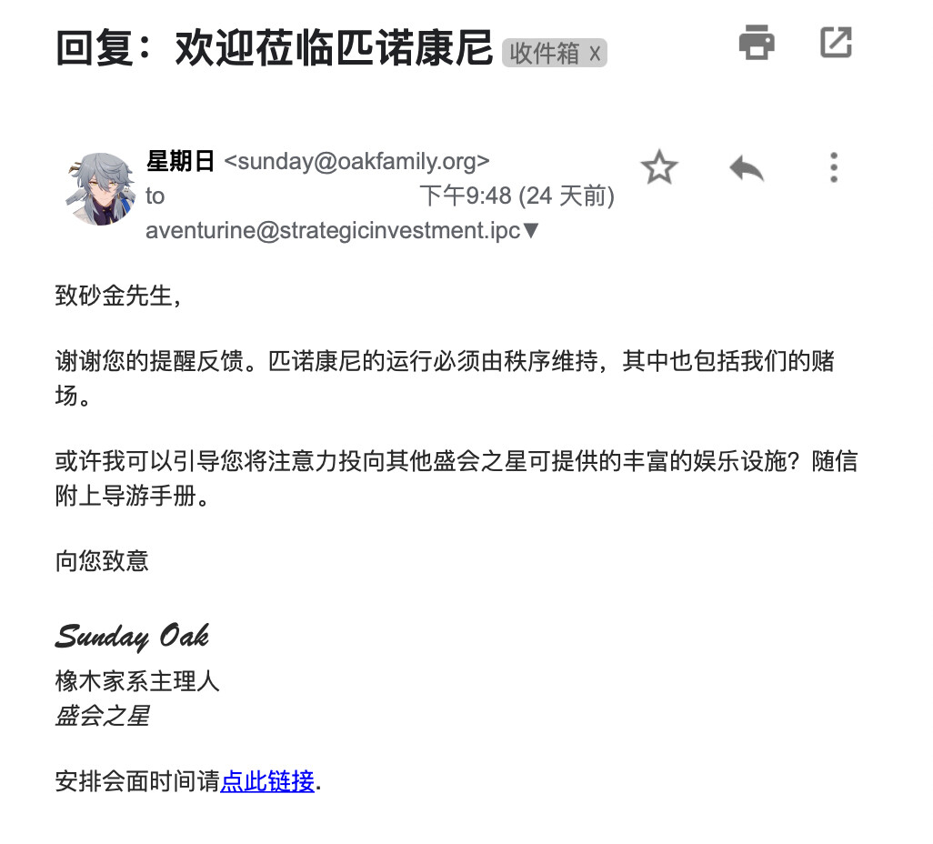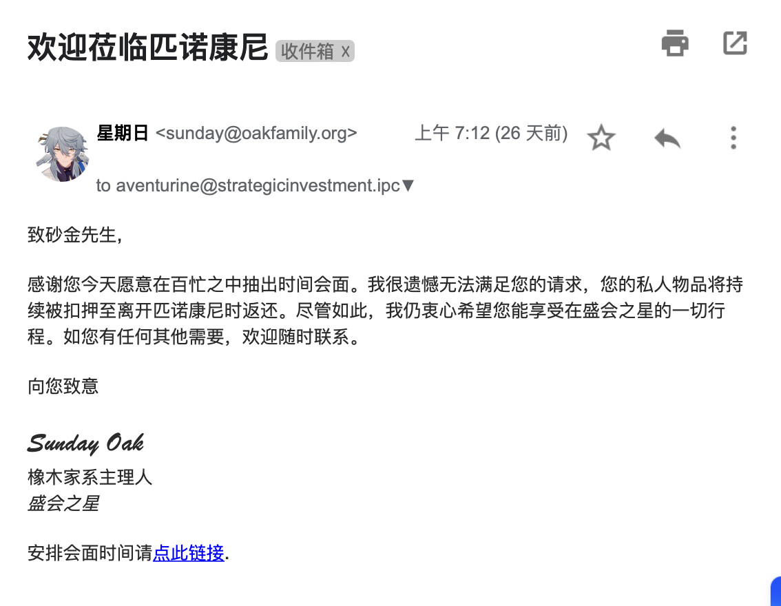 感谢您今天愿意在百忙之中抽出时间会面。我很遗憾无法满足您的请求,您的私人物品将持续被扣押至离开匹诺康尼时返还。尽管如此,我仍衷心希望您能享受在盛会之星的一切行程。如您有任何其他需要,欢迎随时联系。
